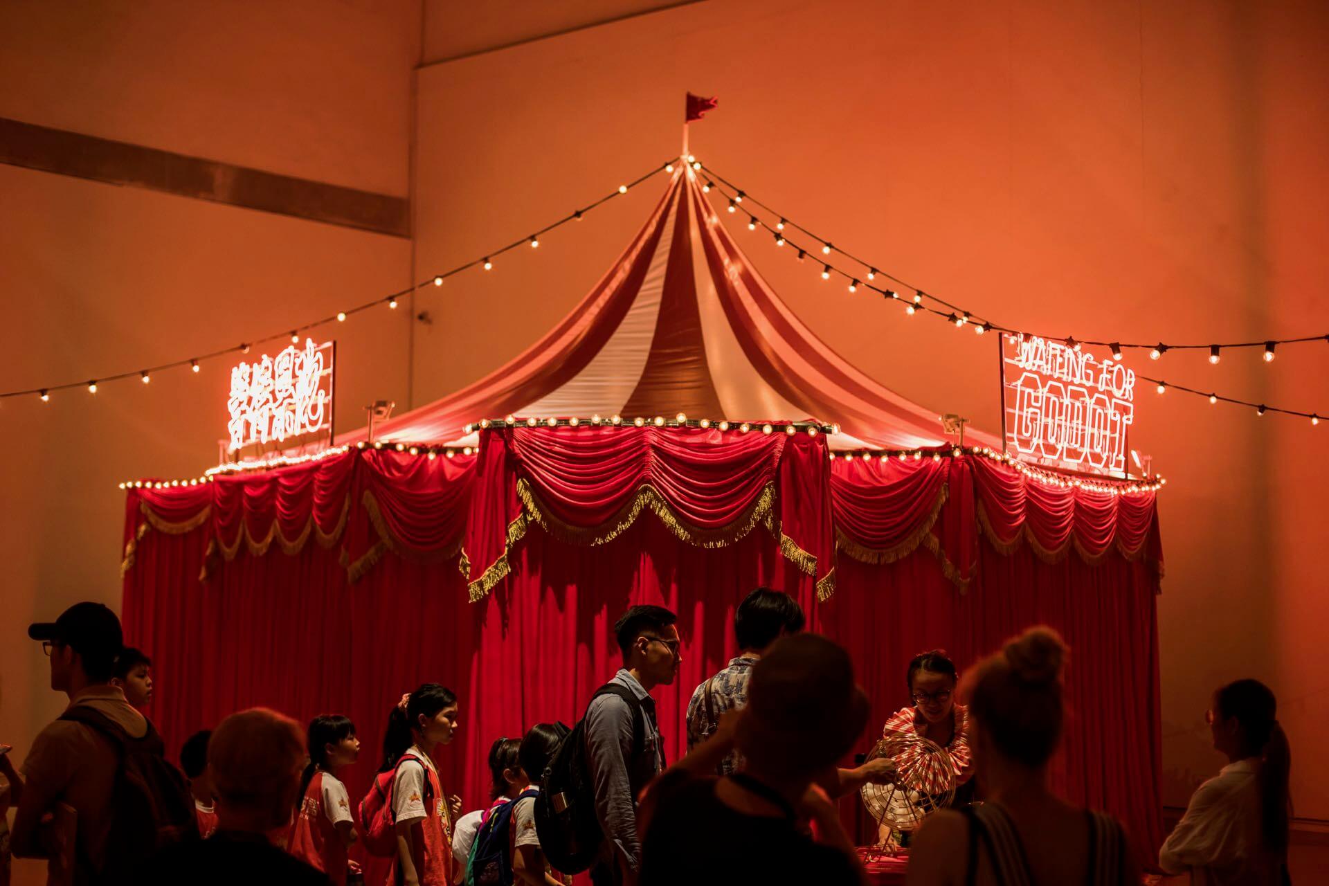 明日和合製作所(明日和合)於2017年受策展人蕭淑文之邀,於臺北市立美術館(北美館)呈現《等待果陀》。作品雖然以貝克特(Samuel Beckett)經典文本為名,但形式本身並非景框式舞台的演出,也沒有先預先安排好、需要按照貝克特劇本演出的「演員」。洪千涵、黃鼎云與張剛華三位明日和合的成員在北美館的高挑空間中搭了一個馬戲般的大型帳篷,帳篷入口處霓虹燈招牌大大亮著WAITING FOR GODOT。希望進入帳篷一探究竟的觀眾必須先領取號碼牌,等候工作人員搖動彩球,隨機抽取出幸運的觀眾,有幸被抽到的觀眾,可以獲得入棚五分鐘的體驗時間。觀眾進入棚內後會發現,除了計時器之外,棚內並無他物。由於觀眾不確定是否有事件會在體驗結束前發生,所以多數人都會在棚內待滿五分鐘,直到計數器讀秒結束,工作人員進棚通知時才會離場。這不禁讓人思考:這個「不只是表演」的參與式作品,到底想讓我們「等待」什麼?