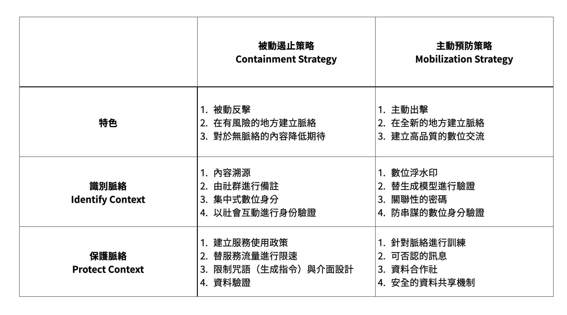 此外,多元宇宙學術網絡(GETTING-Plurality Research Network, GPRN)學者蕭亞.傑恩(Shrey Jain)與柔伊.希齊(Zoë Hitzig)於今(2023)年10月發表《脈絡信心與生成式AI》(Contextual Confidence and Generative AI),重新盤點在後湧現時代,如何抗衡假訊息、創作抄襲等行為。他們認為唯有討論上下文的情境脈絡,才有可能辨識何者為真,而非從文本本身窮究真假。傑恩等人提出脈絡需要被有效識別(Identify)與保護(Protect),而其策略可以是被動遏止(Contaninment)與主動預防(Mobilization),相關盤點可以參考下圖。僅舉數例:識別方面,內容的溯源保真,便為被動遏止,更多案例參見筆者上期文章〈防偽與公證,為何真品/珍品需要數位鑄造?淺談信任科技作為一門產業〉,而主動蓋上浮水印,便是主動預防;在保護脈絡方面,上述的下咒禁令(Prompt Protection)便是被動遏止,資料合作社(data cooperative)實現盈利,便為主動預防資料濫用。