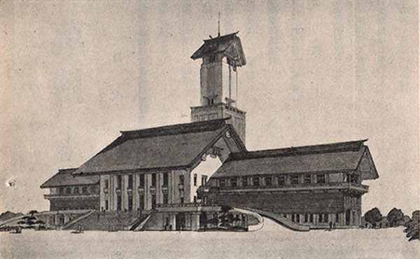 有趣的是,從丹下健三的代代木競技場,一直到岡本太郎對於繩紋文化的熱愛,都可以看到某種戰前日本文化塑造的遺緒。原定於1940年東京萬博會場中新建的主展館被稱為「肇國記念館」:「肇國」即為「建國」之意,時值皇紀2600年,為了將日本的國體推回神武天皇即位之時,當時的大型紀念建築都流行某種回歸至古代日本形式的「古風」。丹下健三1942年設計的「大東亞建設記念造營計畫」,以及1943年設計,預計建設於曼谷的「在盤古日本文化會館」(當時的泰國仍是軸心國成員)都呈現出濃厚的日本古代建築符號。這套對於符號形式的運用,被丹下於1964年的競技場案中被巧妙地轉化。