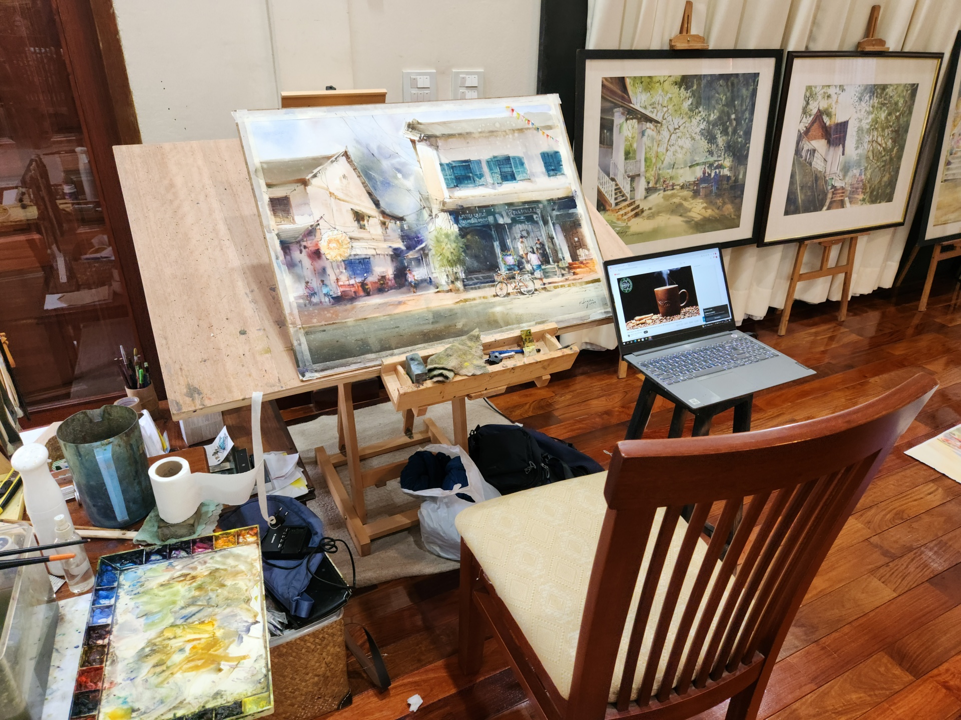 水彩畫家Hongsa Khotsouvanh便表示,材料和工具的取得一直都是最大的挑戰。他必須要透過在日本的朋友取得特定的畫筆,而專業水彩顏料在寮國要取得也是所費不貲,甚至疫情期間還曾遇到材料斷炊的困境。除此之外,由於國內缺乏相關的市場,裱框費用也是高於其他國家。藝術家只能DIY從中國貿易商那邊批來一些堪用的木框,每次展覽時透過重複使用節省開支。Hongsa表示,由於在寮國畫水彩的成本很高,造成大家卻步,但這也是他堅持選擇水彩這個媒材的原因。