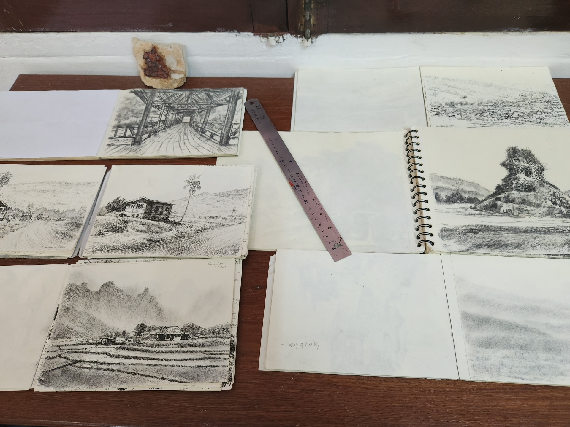 雙個展的展場展示著許多來自寮國各處的寫生,搭配上日記、沿途的速寫、照片及文件資料,讓人不禁敬佩起這兩位年輕藝術家的精神,但亦讓人覺得也許寮國人的自我認同仍舊是襁褓中的嬰孩,仍舊處在建構之中的階段。展場負責人,i:cat gallery的Catherine O’Brien和我提到,兩位藝術家在鄉村地區寫生時,多少讓鄉民覺得擔憂。這種對外人的恐懼或許和寮國的遺世獨立有關係,但亦可能和該國的社會主義體制有關係。