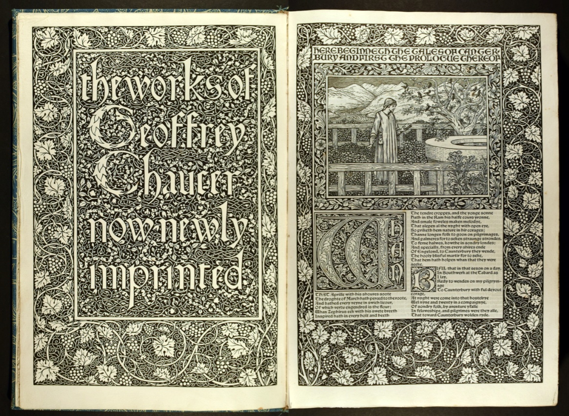 1896年,英國作家、藝術家兼設計師威廉・莫里斯(William Morris, 1834-1896)終於實現了他的畢生志願:發行限量印刷的木刻插畫版《喬叟作品集》(The Works of Geoffrey Chaucer now newly imprinted,以下簡稱《喬叟》)。新版本中,精緻的蔓藤花紋覆滿文字周圍的頁面,並且大手筆收錄了87幅畫家伯恩-瓊斯(Edward Burne-Jones)的插圖。在印刷技術正突飛猛進的工業革命時期,莫里斯彷彿使中世紀修士以纖細畫裝飾的手抄本傳統重現於世人眼前。