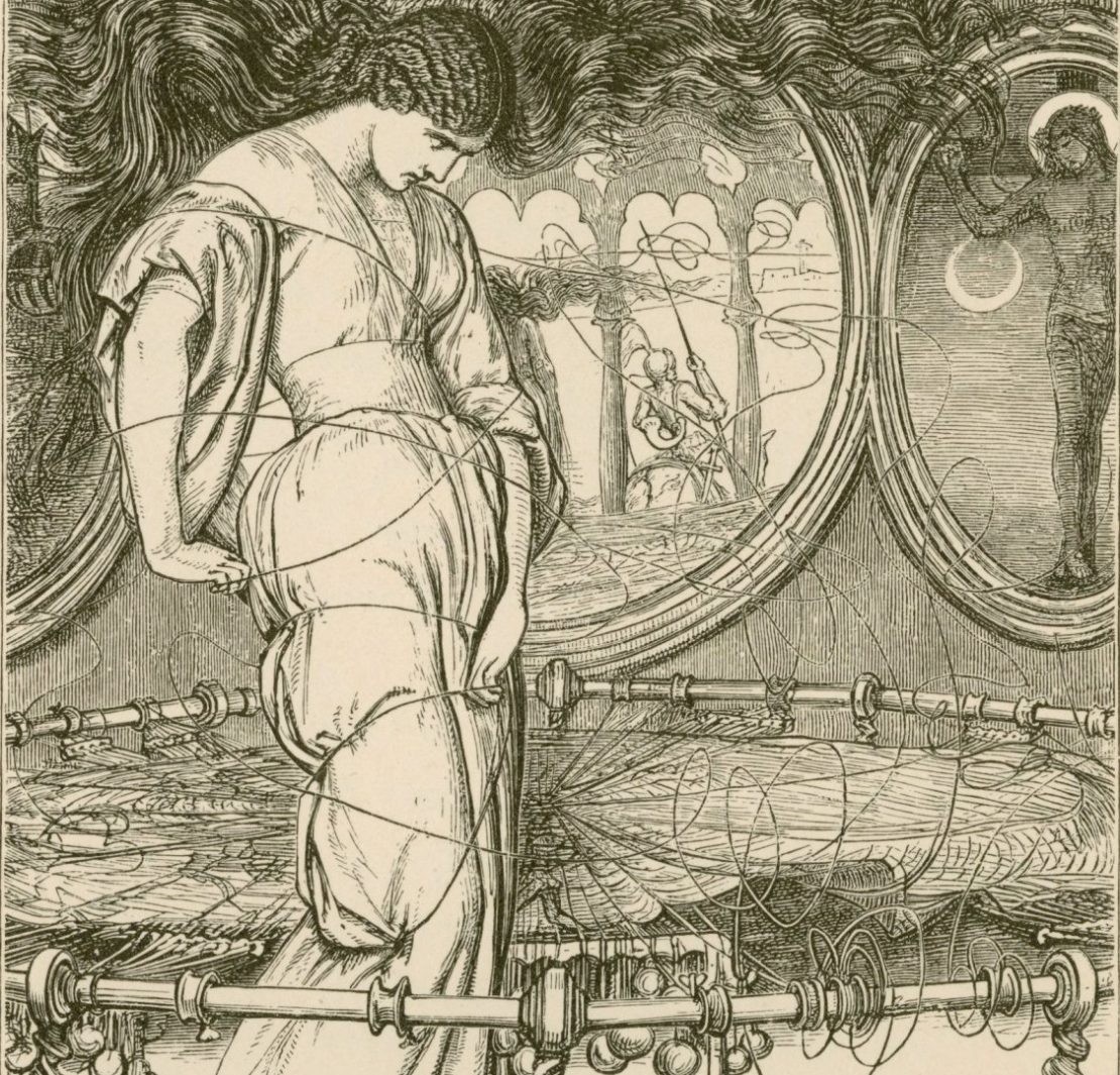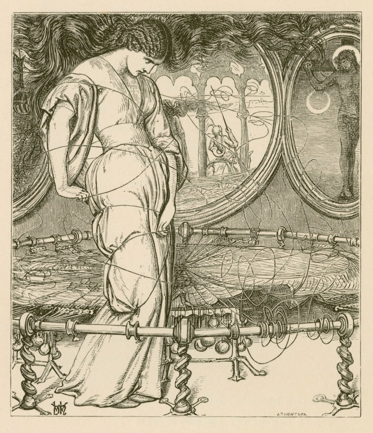 杭特的插圖呈現的便是詛咒降臨的一刻,他筆下飛起的織網緊緊纏繞在夏洛特姑娘的身上,強調她那無法掙脫的詛咒命運;她的長髮張開飄在空中,呼應著織網的糾纏線條,也增添了詩中的魔幻意味。而窗外騎士則對屋內的景象渾然不覺,戴著羽飾頭盔的背影正離她而去。