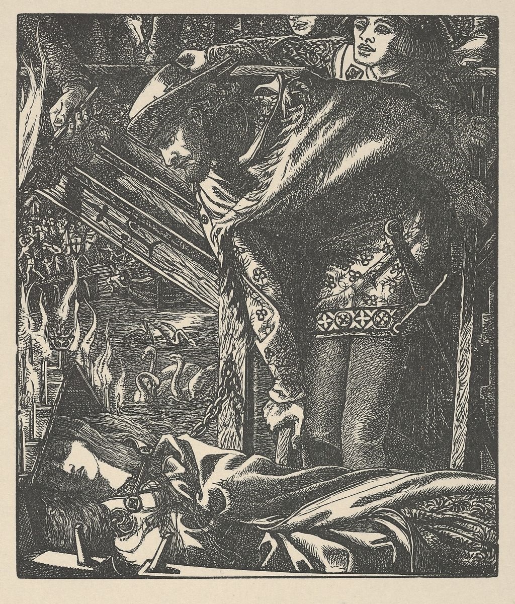 或許可以這麼說,克莉絲汀的詩作不僅具有中世紀傳說色彩,又呼應著當下的社會景況,即使沒有畫家哥哥的加持,也不難想像它們將吸引前拉斐爾派畫家的理由。但另一方面,羅賽蒂的插圖也的確為她的詩集帶來了畫龍點睛的效果:畫面中每一細節都恰如其分,回應著《丁尼生詩集》中類似的中世紀風格構圖。