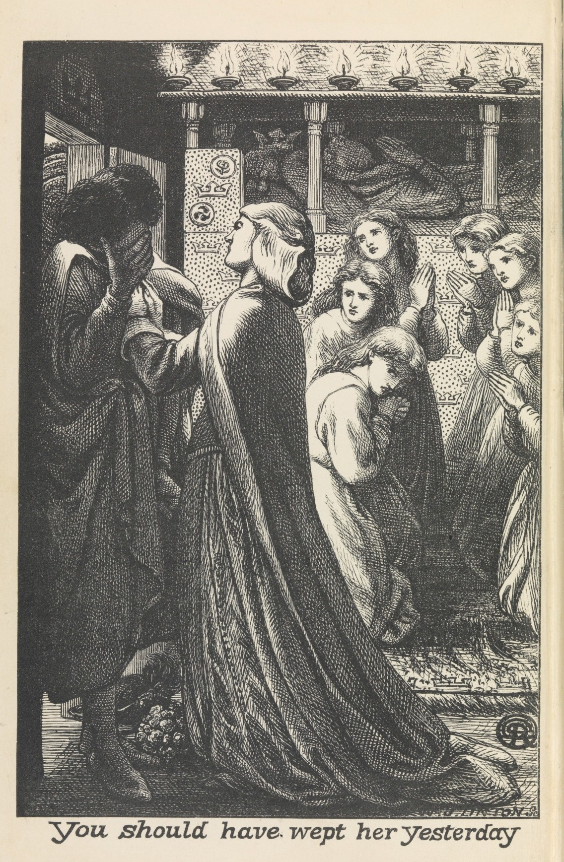 克莉絲汀的長詩〈王子歷程〉對當時兩性角色的諷刺頗為明顯。詩作中的公主癡心等待王子的歸來,而當路上不斷耽擱的王子終於姍姍返回後,卻發現公主已經去世。羅賽蒂為詩集所製作的卷首圖版〈你應該昨日為她哭泣〉描述的是詩歌的結局:左方剛進門聽聞噩耗的王子以手掩面,悲痛欲絕的身影完全籠罩在陰影下。詩中描述的「太過鮮紅的玫瑰」掉落腳邊,右後方為公主吟唱的侍女們排成兩列,擺出整齊中略有變化的祈禱姿態,以投向王子的視線表達出無言的譴責。在插圖背景中,排列在陵寢上的燭光巧妙形成畫面的光影效果,而等不到伴侶的公主躺臥其中,人們再也見不到她的美麗容顏。