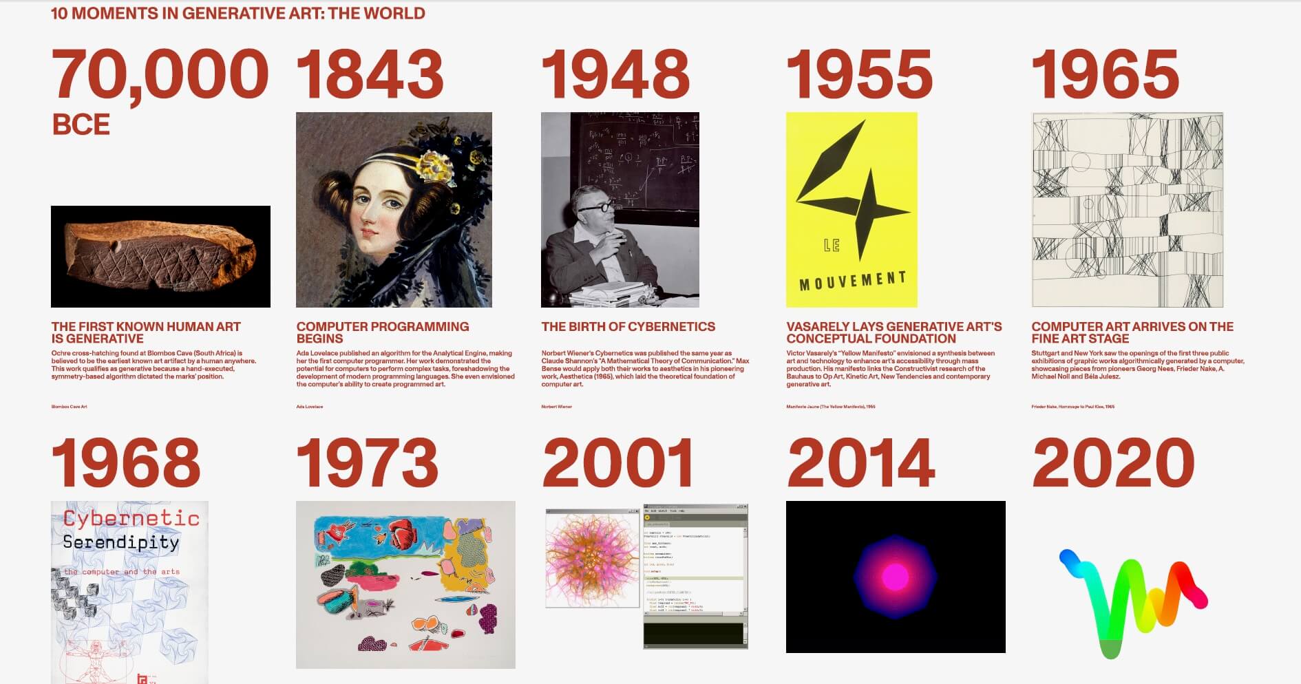這個擴展的結果是一個啟迪人心的恢弘史觀。與社論頁面並列的,是另一個獨特的「時間軸」(Timeline)敘事。從1950年起,Le Random逐步追索跟「生成」概念有關的藝術流派、思想、運動、創作者和藝術及學術作品;以十年為斷代,直到我們身處的2020年代。讀者可以看到1950年電腦科學家Edmund C. Berkeley出版的刊物《電腦與自動機》(Computer and Automation),以及隨後每一年技術和思想的新進展。儘管網站現在只更新到1970年代,但如果參與今年五月東京的Bright Moments活動,在現場聽過Le Random成員的介紹,必然拿過那張把1850年前——甚至遠達西元前70,000年——的長段歷史演繹至當下的海報「生成藝術的十個重要時刻:世界」(10 Moments in Generative Art: World)。原來早在遠古時期,特別是南非布隆伯斯洞穴(Blombos Cave)有著「人類最古老畫作」之稱的壁畫中,已存在根據演算概念而來的線條。到了21世紀的10年代,非同質化代幣和數位作品的鏈上發展,為此前延伸了超過半世紀的生成藝術找到堅實的數位網路基礎,生成藝術不再只有概念與審美的一面,更結合了區塊鏈技術在所有權和隱私權方面的突破、智能合約多版次差異性的創造,改變了既有藝術產業和生態。
