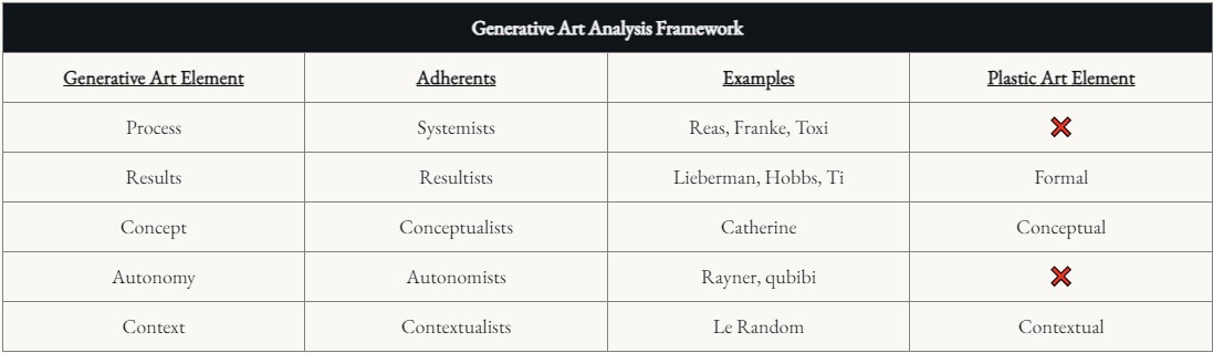 如果thefunnyguys是Le Random的門面——我們在Bright Moments現場隨時可以感受到他的親切笑容,出身收藏世家、本身也是大藏家的他顯然跟許多藝術家交好,足以成為這個收藏機構的代表人物——那麼化名「僧侶安東尼」(Monk Anthomy)的Peter Bauman則是Le Random的智囊寫手;在網頁上,他的身分正是研究員。Le Random成立前,我們對這個名字的認識,可能來自另一個關注藝術NFT的線上雜誌Right Click Save(簡稱RCS,由另一位著名的數位及生成藝術評論家Artnome成立,本名Jason Bailey),但後者並沒有打造藏品和歷史敘事的行動。Peter Bauman發表了許多精湛文章,在〈生成藝術揭秘〉(Demystifying Generative Art)一文中,他從不同藝術家的著作和訪談中歸納出「生成」概念的不同流派,並加以統整,爬梳它們的關係。我們看到,強調「系統」(system)整體性的是一類,生成「結果」(result)之多樣性的是一類;往前追溯先於系統的「概念」(concept)是一類,往後探查結果生成之前系統「自發」(autonomy)過程的也是一類。在這四種類型之後,Peter Bauman把Le Random關注的生成概念定位在「脈絡」(context),亦即不拘泥特定取向,靈活就各個層面接近生成藝術,將它放入不同時空、事件和方法下來認識。作為史學的關鍵字,「脈絡」一詞讓我們再次感受到Le Random寫史的雄心。