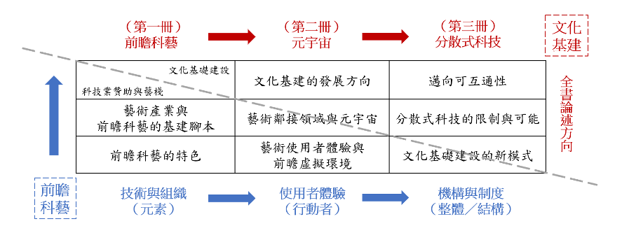 第一冊介紹「前瞻科藝」(Art & Advanced Technology),第二冊轉向藝術與「元宇宙」(Metaverse),第三冊則是藝術與「分散式科技」(Decentralized Tech)。第一冊尾聲埋的哏──「21世紀文化基礎建設」(21st century cultural infrastructure)只是一小節──到了第三冊已占據全書篇幅,首冊主力「前瞻科藝」成為前備知識,不再論述;第二冊標榜的「(藝術)使用者體驗」為一、三冊的過渡。全書由淺至深,從當前入未來,「元素→整體」和「行動者→結構」的推展堪稱縝密。