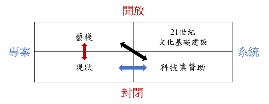 顯然上述兩者一定程度地拉抬了前瞻科藝,卻也受制於市場的資本規模,服務於其他局部目的。因此,是否存在一個專門支持前瞻科藝的生態系,從整體角度來回應並對接廣泛社會議程(societal agenda)的「21世紀文化基礎建設」,就是重要課題。