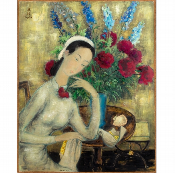 黎譜憑藉《少女與芍藥花》的精湛技藝吸引了觀眾。豐富的色彩,巨量的尺幅和非凡的保存狀態使得這幅自Romanet畫廊購得並保存了70多年的作品如此與眾不同,是該藝術家作品中的一幅傑作。它見證了畫家風格從表現越南傳統文化的主體的象牙色和棕色色調演變為炫彩奪目的西方藝術風格的後景花束呈現。