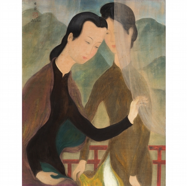 《憑欄姐妹花》是黎譜早期的絹本畫作。他以精湛的畫藝細膩地展現出女性獨有的溫柔。兩個可愛的越南小姐妹倚欄於秀麗的風光中。透過她們豐富的面部表情和彼此環繞的手臂又表現出了她們二人複雜的關係。黎譜利用擅長的薄紗透視畫法,觀者將會不自禁地被這對姐妹邀請至憑欄處。