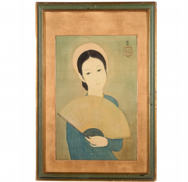 梅忠恕《持扇少女》(L’éventail),1941 絹本設色,右上角簽名、日期 尺寸:39.5 x 27.3 cm 出處:1941年維希Lorenceau畫廊/維希私人收藏/後代藏于摩納哥。(法國奧古特拍賣公司提供)