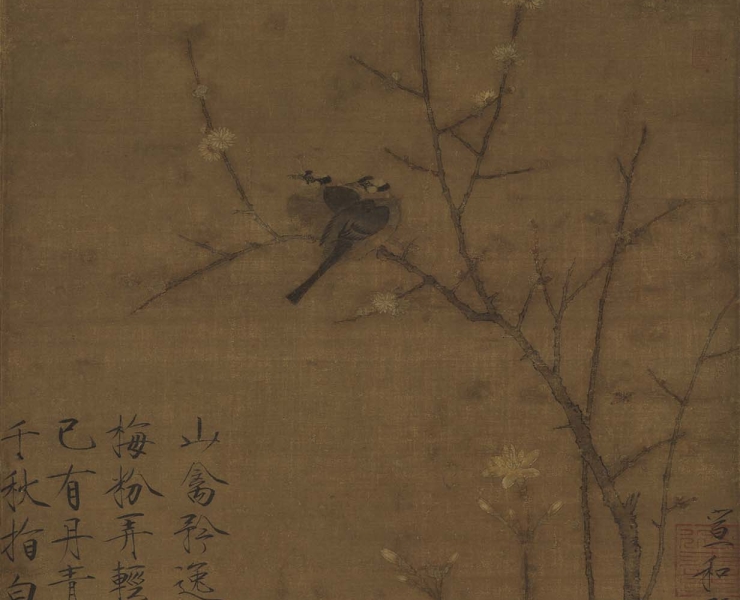〈蠟梅山禽〉畫上徽宗題道:「山禽矜逸態,梅粉弄輕柔;已有丹青約,千秋指白頭」(圖6)。前兩句描述相依偎的鳥兒姿態安逸,而...