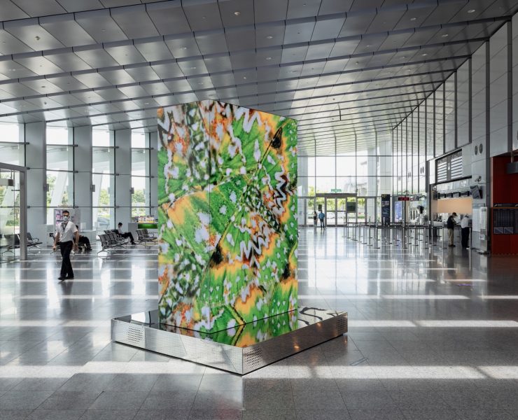 在車站大廳中央,300x200x100公分細緻無縫的五面體LED CUBE裝置,展示著藝術家以微觀視角巨大化其所採集到的...