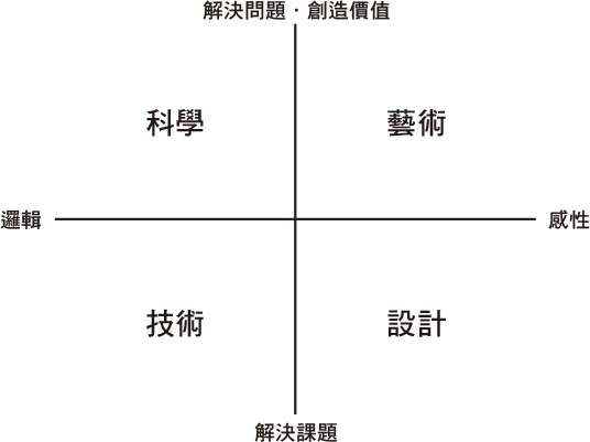 試著以「解決課題─提出問題,創造價值」以及「邏輯─感性」這兩大軸來分析這些關係,然後將技術、科學、設計、藝術分別配置後,便成了上方的圖示。
