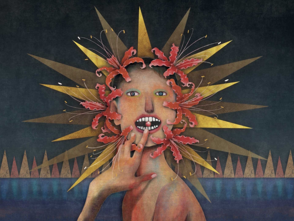 反覆讀了文字幾回後,一直對其中敘述紅色小藥丸與彼岸花的文字印象頗深,眼前浮現正要服下紅色小藥丸的「完美的終極之人」,於是畫下他以手指顫顫的送藥丸入口,在準備吞服、還猶豫地以唇齒咬著藥丸的瞬間,殷紅的彼岸花突然大綻,在耳邊鼓勵著他儘快吞下,準備迎接揉和後悔與驚奇、穿梭天堂地獄之間的刺激與狂喜。