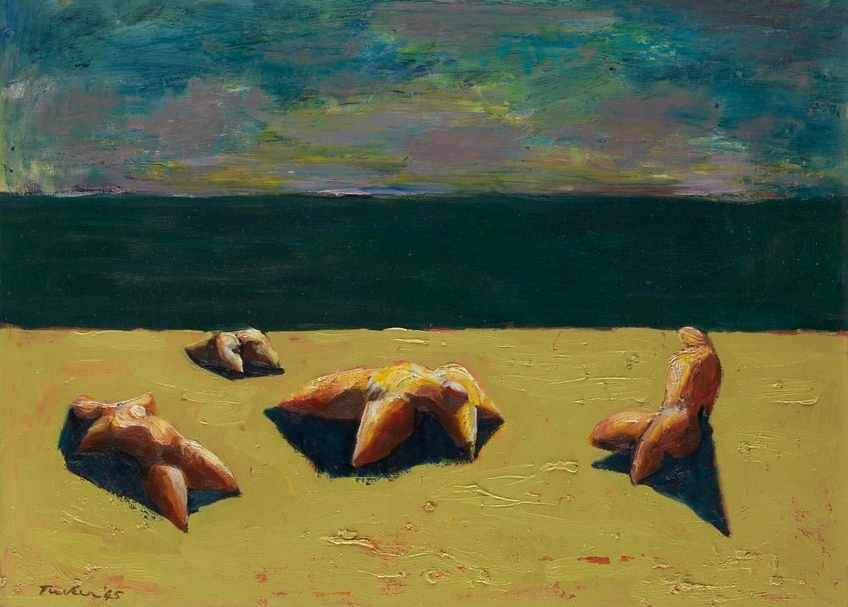 亞伯特.吐克(Albert Tucker)《太陽浴者》(Sunbathers),油彩合成版,44.4×61.4cm,1945。(© www.ngv.vic.gov.au)