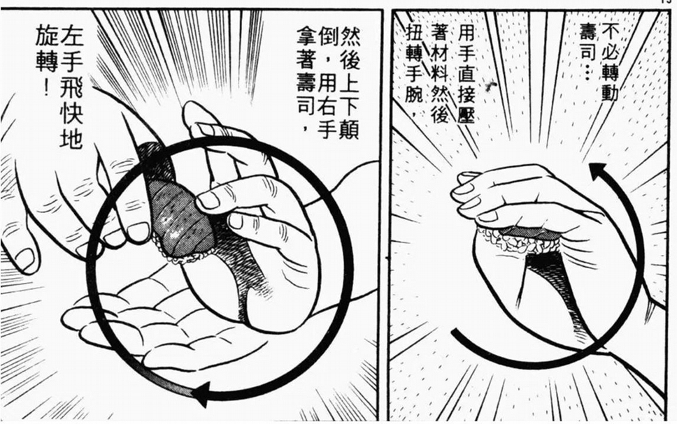 這也讓我想起在在日本漫畫家寺澤大介(寺沢大介,Daisuke Terasawa)所繪的一個情節,所以也用在文中。那是在《將太的壽司》(将太の寿司,1992-1997)系列漫畫第九集時,關口將太在東京壽司師傅大賽中遭遇清川流也。比賽的主題是「握壽司競速賽」,而清川流也有「捏製機器」之名。此人捏製速度極快,平均完成一個握壽司只需要4秒鐘。且擁有「小手返握」神技,只要三手(步驟)就可以完成一個握壽司。然而,壽司習藝五年減一手,將太初入行,約莫要六、七手才能完成,習藝多年的小政師兄需四手,資深的大政師兄僅需三手。面對這樣的速技神手,初到「鳳壽司」習藝的將太該怎麼辦?這位有天份潛力的漫畫主角就想出了幾個重要的「微技巧修正」與「材料準備」創新想法,有效地縮短捏握壽司的速度,也就是: