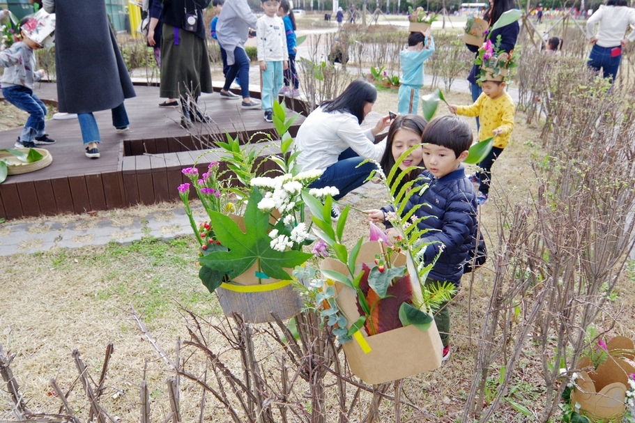 活動的當天的一大早,我跟PLAY31的成員們來到花市,選購事前決定好的新鮮植物材。活動的開始,先用很快的速度介紹自己的背景,輔以朋友的韓文翻譯,介紹設計師從論文為主軸延伸設計了這個工作坊。接著正式開始,首先,詢問了在場的小朋友們(15組親子)最近有沒有接觸自然植物,是在哪裡的看到的呢?小朋友輪流說著在山上、在學校的菜圃、從陽台的盆栽各式各樣答案,也請小朋友試著形容多一點自然體驗。大家你一句我一句,偶爾跟媽媽討論(這場工作坊15組全數只有媽媽出席沒有爸爸,韓國朋友對於這樣一面倒情況早有預料),回憶著小花、小草跟自己的盆栽,還有爬山的故事,這些都會是接下來頭冠上的題材。而接著進到今天的主角,認識植物的多樣貌。我們準備的項目包括了充滿味道的植物、不同的大小、顏色,形狀與質感,一一介紹並請小朋友親自體驗,一邊想想等會要怎麼運用這些植物來裝飾頭冠。