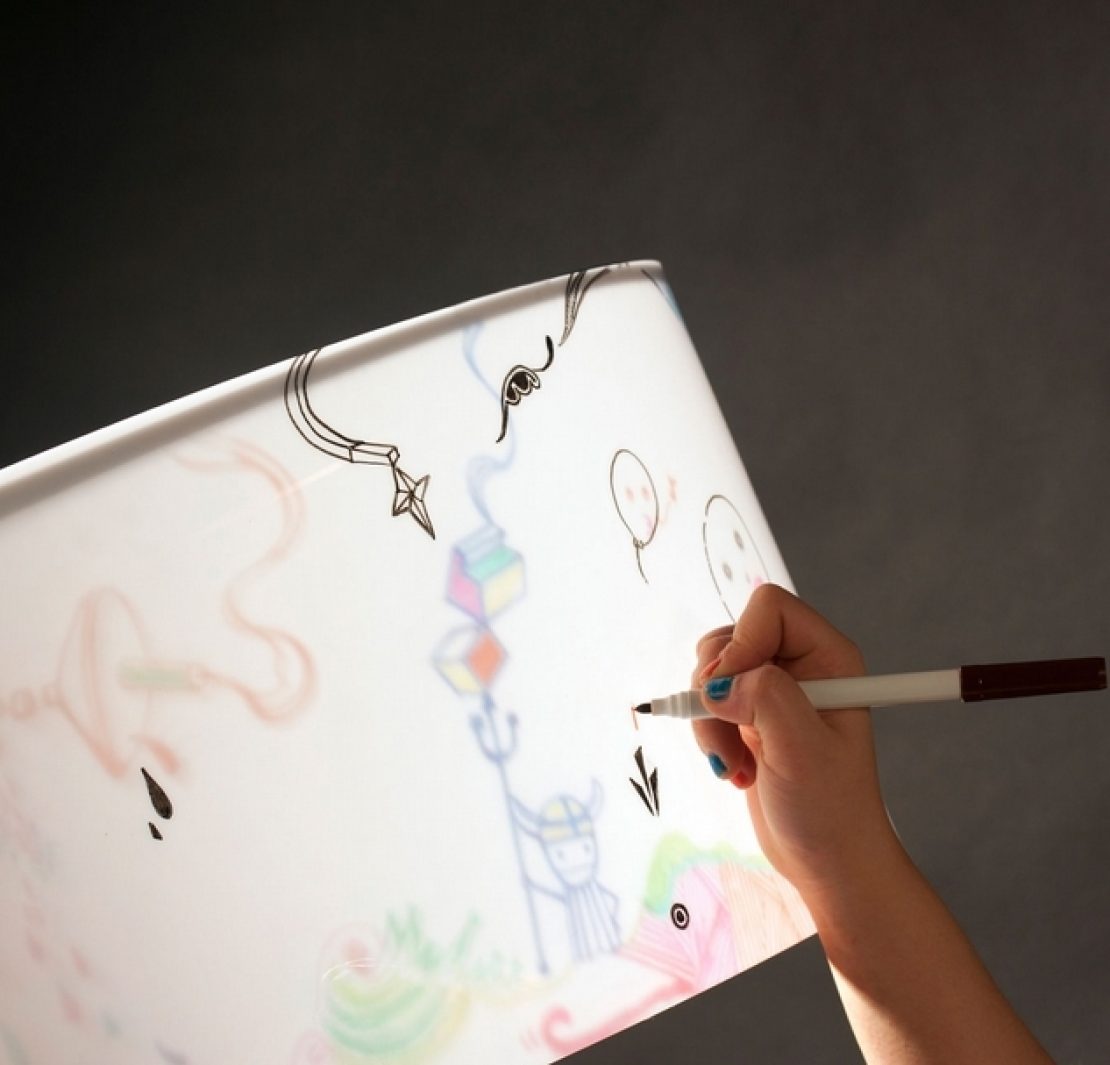 燈罩的大小是剛好可以讓小朋友輕鬆進入,大人不能夠輕易窺見的尺寸,彷彿一個屬於他們專有的秘密空間。燈泡採用附有防燙散熱片的LED光源,燈罩為兩層可反覆繪製、擦拭的材質的設計。在沒有開燈的情況下,畫在內層燈罩上的內容並不會被看見,燈被點亮時,原本看似乾淨的燈罩則充滿了孩子的創作內容,同時也像是點亮了他們的權利。若父母也願意一起玩一起畫、寫在燈罩的外層,小朋友從內層作回應,這件家具則成為增加溝通與互動的媒介。