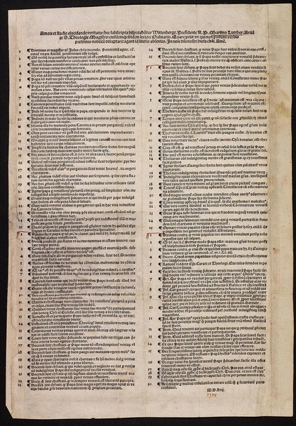 在馬丁.路德(Martin Luther)公開「95條論綱」之後,即使在路德本人不見得情願的狀況下,這份論綱仍很快地被大量印刷,流傳了出去。此圖為1517年於紐倫堡(Nürnberg)所印製的版本。(CC BY-NC-SA 3.0 DE)