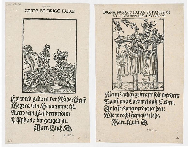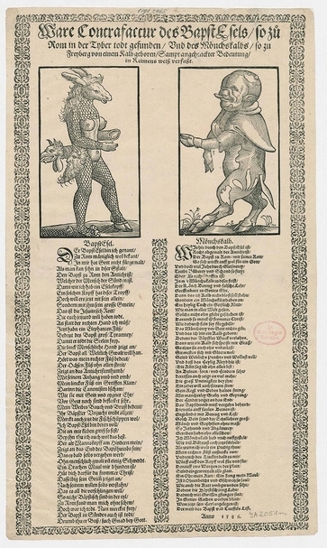 在路德與他的支持者製作用來攻擊教會的傳單中,流傳最廣的是將教宗與修道士描繪成「驢子怪物」與「畸形牛犢」的圖像。不過,這些圖像並不僅只是將羅馬教會「妖魔化」而已。在這些傳單上簡短的圖說中都點明了圖中的「怪物」是在何年何地所發現的:「驢子怪物」的屍體於1496年在義大利台伯河(Tiber)被沖上岸,而「畸形牛犢」則是1522年誕生於弗萊堡(Freiberg)。透過援引這些「真實」的案例,路德不但增加了這些圖像的「可信度」,更將這些「怪物」詮釋成是上帝捎給人類的訊息:一方面,「怪物」揭示了教會的「真實」面目,另外一方面,它們也預言了末世的即將到來。