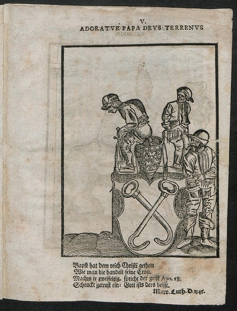 在這邊,我們必須知道的是,路德用來攻擊教會的方式不僅是將教宗呈現成「怪物」而已。譬如,他也將教宗、修道士描繪成由惡魔所生下、由復仇女神撫養長大的一群野人,或是直接呈現出人在教宗的三重冕中「拉屎」的場景 。此外,他更讓他批評的對象直接在圖裡被處以吊行,並展示出魔鬼將他們的靈魂擄走的景象 。在當時,路德的友人甚至問他,是否有必要以如此骯髒、齷齪的方式來推動宗教改革。不過,路德的態度始終堅決。一直到他過世之前,他仍認為,唯有「圖像」才能讓不識字之人看清羅馬教會的真面目。