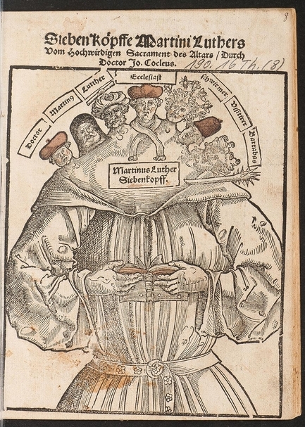 「擁有七顆頭顱的馬丁.路德」,這邊描繪的怪物讓人直接聯想到《啟示錄》中所敘述的「七頭怪獸」,1529年。(CC BY-NC-SA 3.0)