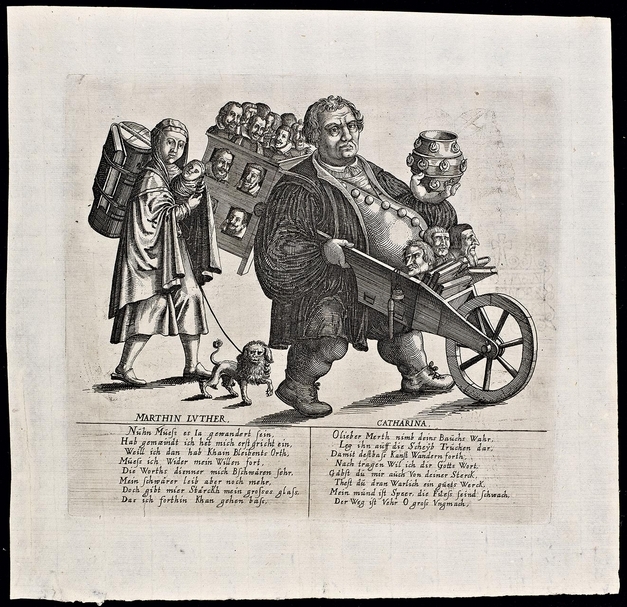 這張傳單描繪被驅逐的馬丁.路德(Martin Luther),他手上的酒杯和凸起的啤酒肚暗喻著他不加節制的生活方式,約1625年。(CC BY-NC-SA 3.0)