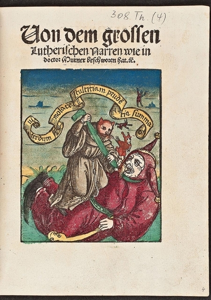 在聖方濟會修士慕內(Thomas Murner,1475–1537)詆毀馬丁.路德的小書《Von dem großen Lutherischen Narren》的封面上,馬丁.路德被描繪成被馴服的愚人,1522年。(CC BY-NC-SA 3.0)