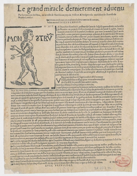 這張傳單「報導」了一位支持馬丁.路德(Martin Luther)宗教改革婦人所產下的畸胎。其中提到,這位婦人在生產前向神父發誓,如果路德真是異端,她將生下一個怪物。而在1544年1月8日,這位婦人確實生下了一個「前後顛倒」的男嬰,1544年。(CC BY-NC-SA 3.0)