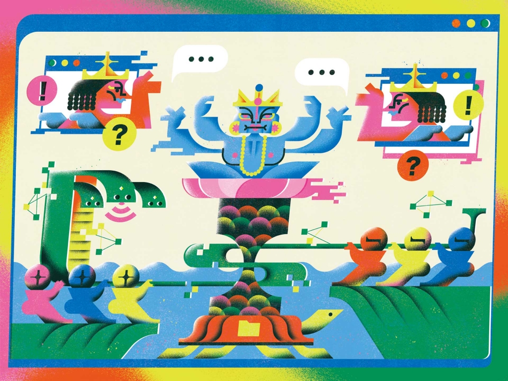 攪乳海是印度神話中一個關鍵的場面,而當今的關鍵畫面都是在視窗裡發生的,因此我把祂們都放進框裡,飛天們散播著的假新聞則像廣告視窗一樣關不掉,無限增生。正派跟反派都有者一樣的臉孔,身形相等,沒有絕對正和負,隨時都得調換過來的。我特別喜歡作者討論的「雜訊」,雜訊吵鬧猖狂,看起來多麽的惡,但正因為雜訊的出現,意識形態之間有了關係,而得以有社會性的誕生。