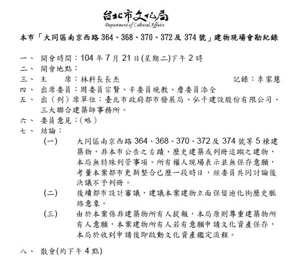 可是文化部知道地方怎樣審文資案的嗎?以台北中和紡織跟桃園京兆堂為例,那些所謂的文資委員,公然以「所有權反對」為由,未主動提供所謂的補償機制,就判定這些老屋沒有文資價值。試問,如果用所有權人意見當成是否要保留的依據,我們為何需要浪費公帑,聘請號稱專業者的文資委員?我們的文資委員有摸著良心仔細「看」嗎?