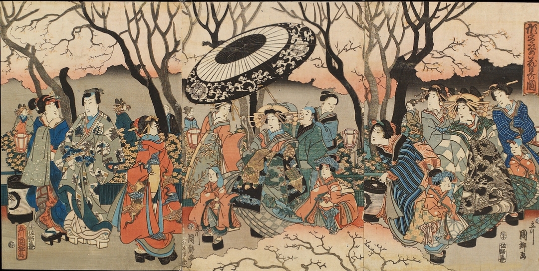 歌川國鄉1856年作〈爭奇競豔賞花圖〉,套色版畫,36.6×74.8公分,國立歷史博物館藏。