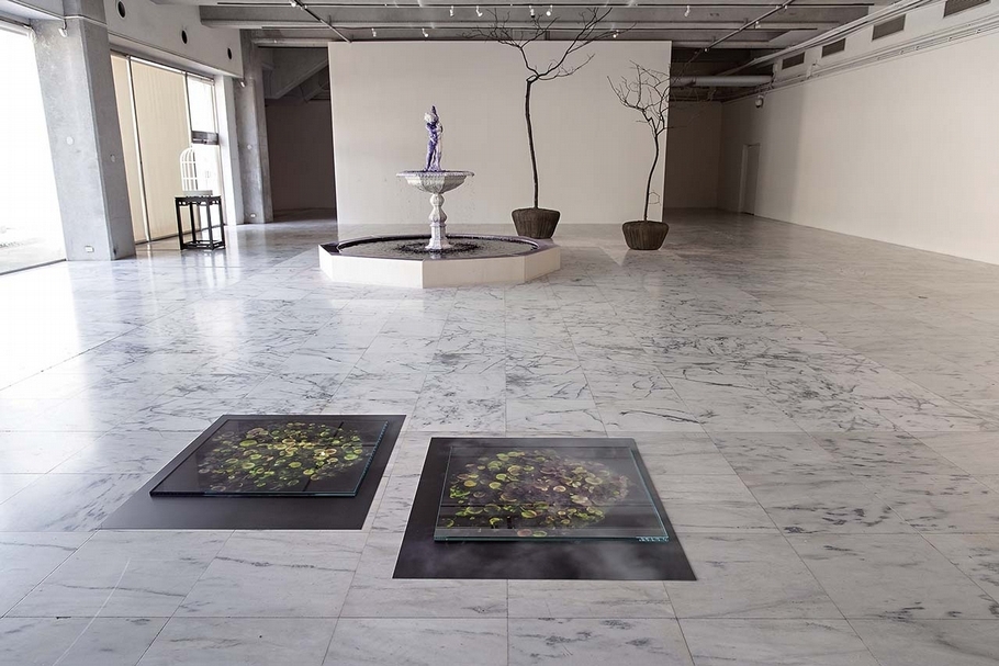 巴洛克的古典噴泉,汩汩流淌著紫色底的墨水,那濺出的池面落在大理石池緣的墨花,淺淺地染出一朵朵細細的、靛藍色的墨花,層層疊疊出無語卻又萬字千言般的文學性詩敘。噴泉旁,那精細鑄造的移栽樹木在修剪、斷根及土球包紮下,即使外觀宛若枯木,卻又彷彿暗示著其處在一個等待新生的狀態裡。以細燈管構成,發光卻空盪開敞的鳥籠,彷彿暗示著等待歸巢又或者是掙脫牢籠……。