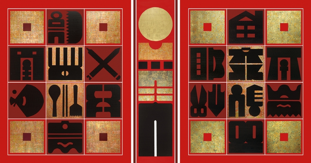 廖修平《新富臨門(一)》,壓克力、金箔、畫布,227×424cm(三聯屏),2013。(尊彩藝術中心提供)