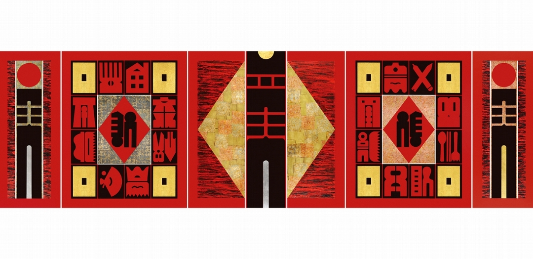 廖修平《迎福門 二》,壓克力、金箔、畫布,162×552cm(五聯屏),2010。(尊彩藝術中心提供)