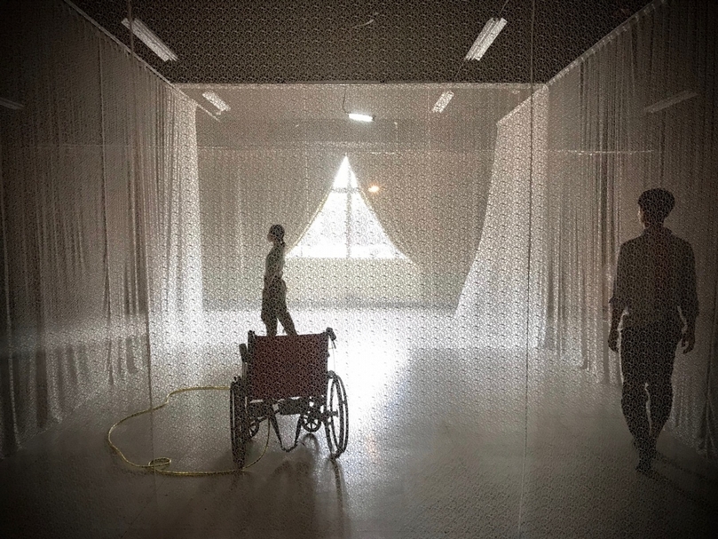 在位於C-LAB聯合餐廳的非典型劇場空間中,編創者們置入了看似無故事敘述軸線的展演,並將空間設計分割為數個不同氛圍的場景。其中,無人的輪椅在白色蕾絲布幔所圈繞的空間中緩緩移動;以黑色棉線纏繞的黝黯空間中,搭配魔鏡意象的屏幕與不斷閃爍的微弱燈光;另一箱覆以彈性布料地面的空間,企圖讓觀眾與舞者顛簸共舞,並對照出漸凍人行動日趨僵硬意念;而轉向另一面,如同客廳的陳設,則是以描述漸凍人的家居生活為主體,擺置著病床、時鐘和餐桌等日常物件。除了思考觀眾與舞者如何在空間中遊走,並讓一個個事件發生之餘,面對空間感的限制也讓團隊回到發想漸凍人概念的初衷。「在我們探訪漸凍人患者的經驗中,能夠發現患者有著諸多生理限制,一如想說而無法言說的禁錮狀態,我們也思考如何讓這樣的限制,能夠透過同樣受限的空間,帶給身臨展演現場的觀眾與舞者近似的感受。」