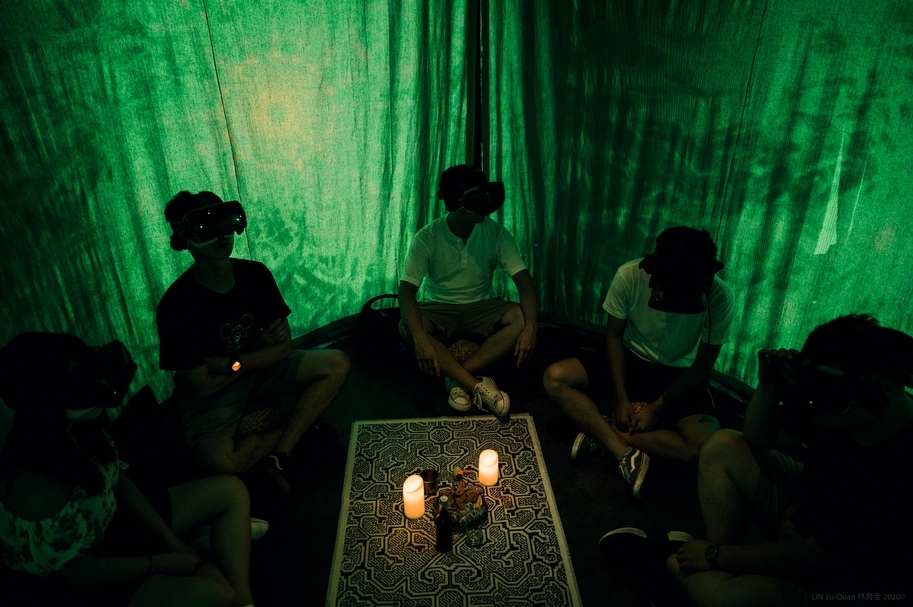 觀眾體驗《迷幻死藤水》(Ayahuasca-Kosmik Journey,2019)現場。(攝影/林育全,財團法人數位藝術基金會提供)