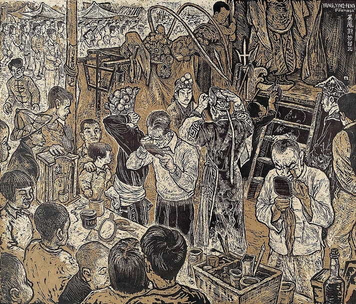透過木刻技法,影像的逐漸成形是相當耗時的,因此藝術家對於手中處理的創作是帶有一定程度的自信把握,才得以完美掌控。作品如1952年的《後台》,透過楊英風的視角取景構圖,讓觀者看到了在不同層次空間裡,卻同時正在發生的畫面,並且捕捉到主題焦點。宜蘭是歌仔戲發源之地,後台演員們上妝的模樣,那獵奇窺視的心情,與前台戲劇的精彩相比,甚至更加吸引人目光。