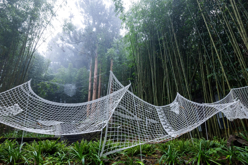 或許外界不免直接把鍾瓊儀與品牌劃上等號,但鍾瓊儀其實會視合作項目的性質與作品形式評估是以藝術家或品牌的身分發表,原則上像是商業空間或藝術季這類有明確策展主題的製作會以品牌名義參與,至於以自已生命脈絡為出發點的就歸類為藝術創作。而目前設置在奮起湖,展期長達三年的兩件藝術裝置可謂近期最特別的創作;纖維作品因保存考量大多在室內展出,而她一直有意探索戶外裝置的可能與材質處理方式,也幸運獲邀參與地景裝置,與執行團隊在作品進場的前一年就展開場勘作業。潮濕的環境條件讓鍾瓊儀決定任憑作品與空間共生,《林間艸台》是以周圍竹林意象設置近300根染色羊毛球的構件,讓苔蘚自然依附在作品上並隨時間持續變化。而《山城樂音》則是結合梭織結合梭織、竹子與編結的織品,意在將環境中的聲響轉譯為音符律動,還驚喜看到蜘蛛在作品上結網,這種互動正是她理想中人與環境共生的狀態。「雖然常常做大型裝置,但相較於多數合作案往往期待作品要很吸睛,這項計畫更傾向我本身的創作狀態,關注於時間遞進的感知觀察,不過這次所觸及的人與環境之關係更為宏大,而且表現形式極具實驗性,也更大程度地拓展創作脈絡的維度。」