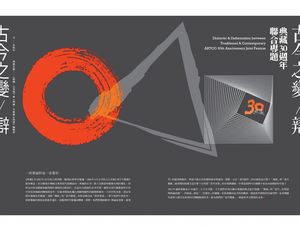 2022年適值典藏成立30週年,古今分刊後,今次我們首度以聯合專題的模式進行規劃。「傳統」與「當代」的對談與辯論是個「一再重返」卻也「一直都在」的議題,但希望藉由這次的再觀看,創造更多開放的討論空間。也希冀擁有深厚人類文化資產的台灣藝術創作者,能為我們的「當代藝術」,創造更多元豐富的未來。