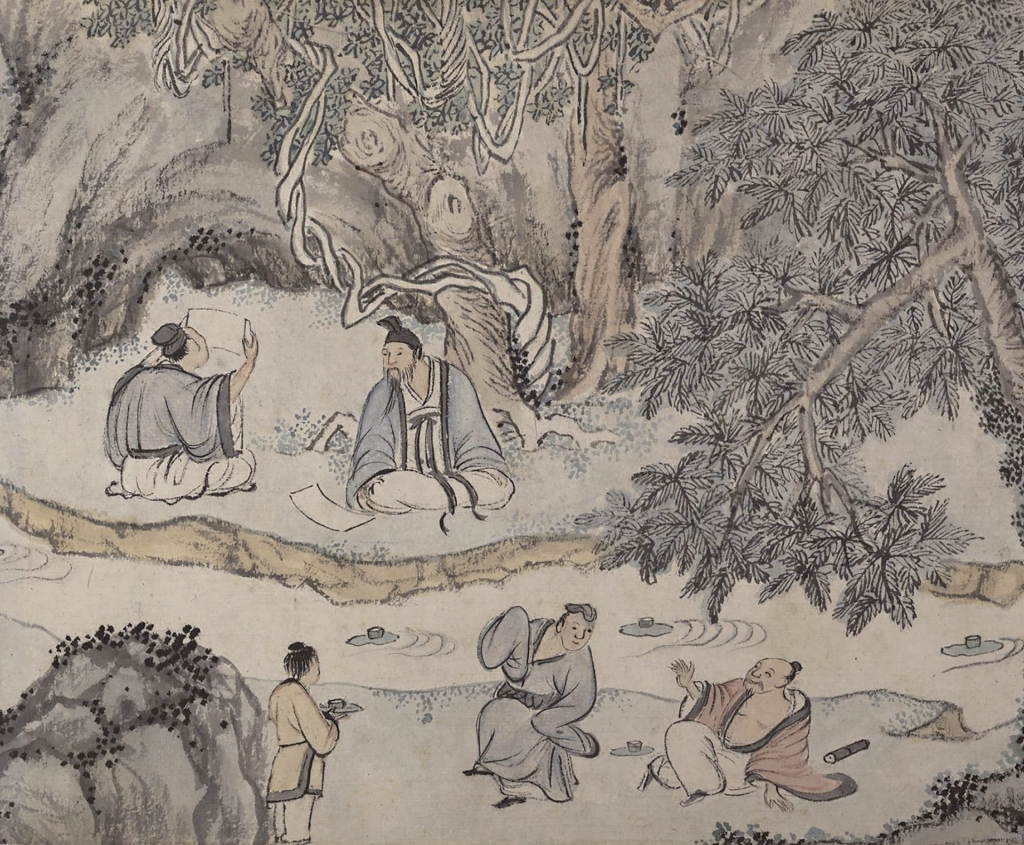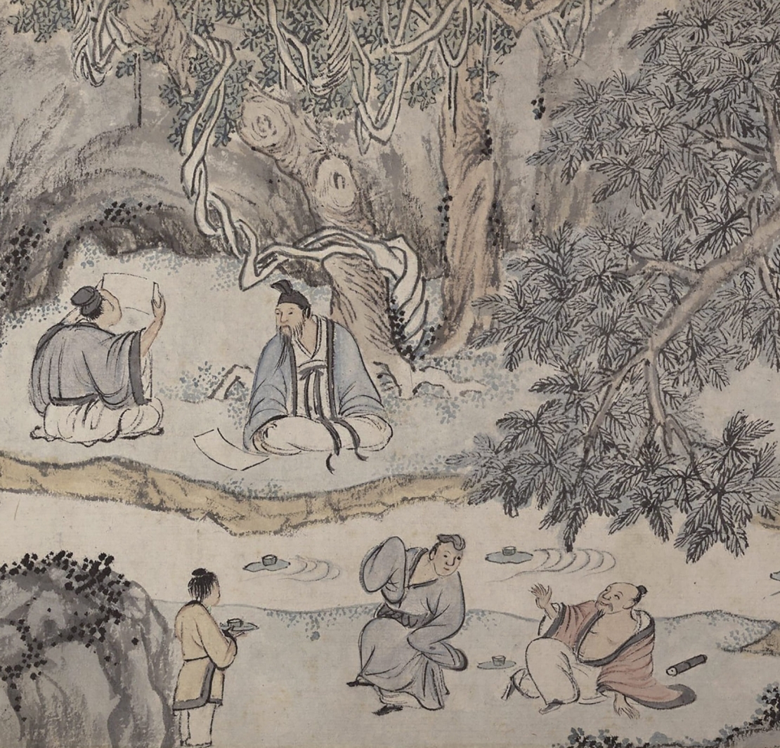 明代畫家錢穀,為吳派第二代傳人,深受文徵明風格影響,設色恬淡,細潤文雅。此圖繪東晉蘭亭集會的場景,山林蓊鬱,蜿蜒的溪流橫貫全卷,酒觴緩緩漂流。文人坐臥兩岸,姿態各異,或吟詩詠賦、或凝望清溪,意興盎然者甚至袒胸露腹,欣然起舞。無論是茂林修竹、曲水流觴和魏晉雅士的神采,皆值得細品。