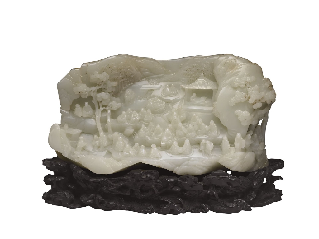 此山子由白玉雕琢而成,略帶淡黃赭色斑,取蘭亭修褉為主題。溪流由山間逶迤而下,兩岸有松竹、山石、亭臺,文士錯落水濱,三五成群,相談甚歡。山子雕工細緻,質地清潤,層次豐富,溪流間還可見小巧的酒杯漂流其上,甚為精巧可愛。