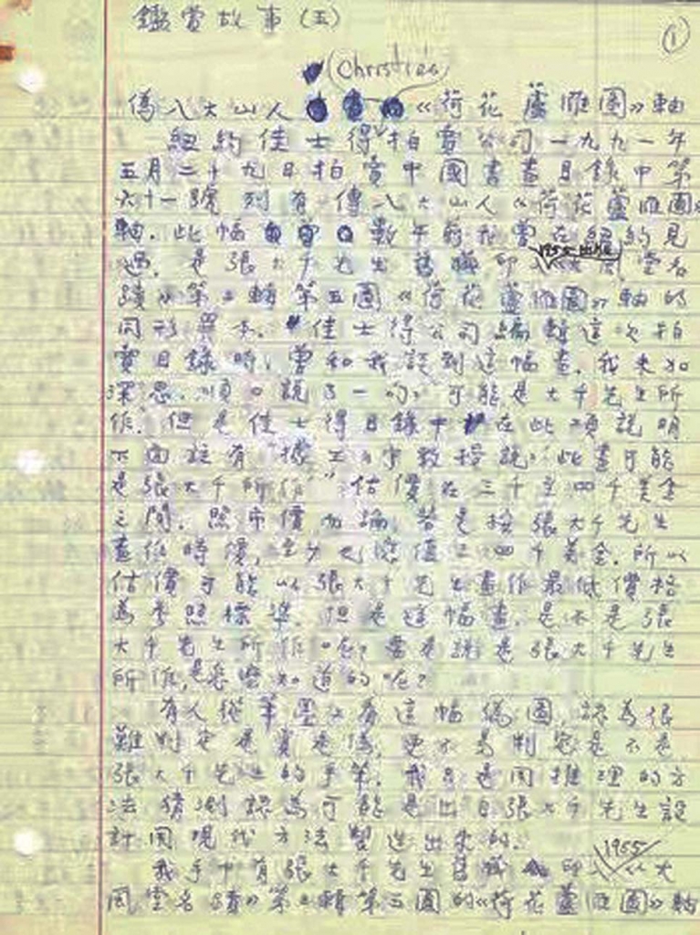紐約秋萌畫廊及FQM藝術與視覺文化計畫創始人付秋萌表示,王方宇為了學術研究,不僅收藏八大的真品,也收藏值得研究的贗品作為對照分析,「我們在1月26至30日展出了他收藏的張大千作偽的〈荷花水鳥圖〉和八大1698年創作的〈荷花水鳥圖〉,讓大家直觀地比較兩者之間的區別,同時還有一幅八大於1694年創作的〈貓石圖〉。」展覽同時發表王方宇對於二件〈荷花水鳥圖〉的研究手稿,其中指出:從照相底片可知兩幅作品的尺寸、部位、空白基本吻合,可能是透過投影方法或玻璃紙和燈桌等方式製作,但無論何者均須有真蹟作為參照;真蹟曾於1943年《大風堂書畫錄》第40頁出版,可知真蹟早於1943年被張大千收藏,論證了此作的製作年代應在1920至1930年代之間,且筆墨技巧高超,少有敗筆,圖章精良,似張大千作偽圖章時用照相製板的鋅板印章,「最終王方宇得出結論,張大千作偽的可能性極大。」