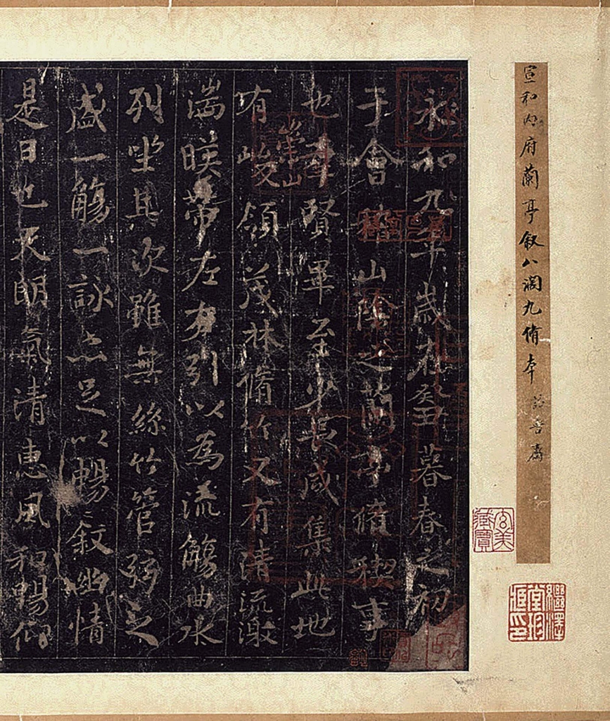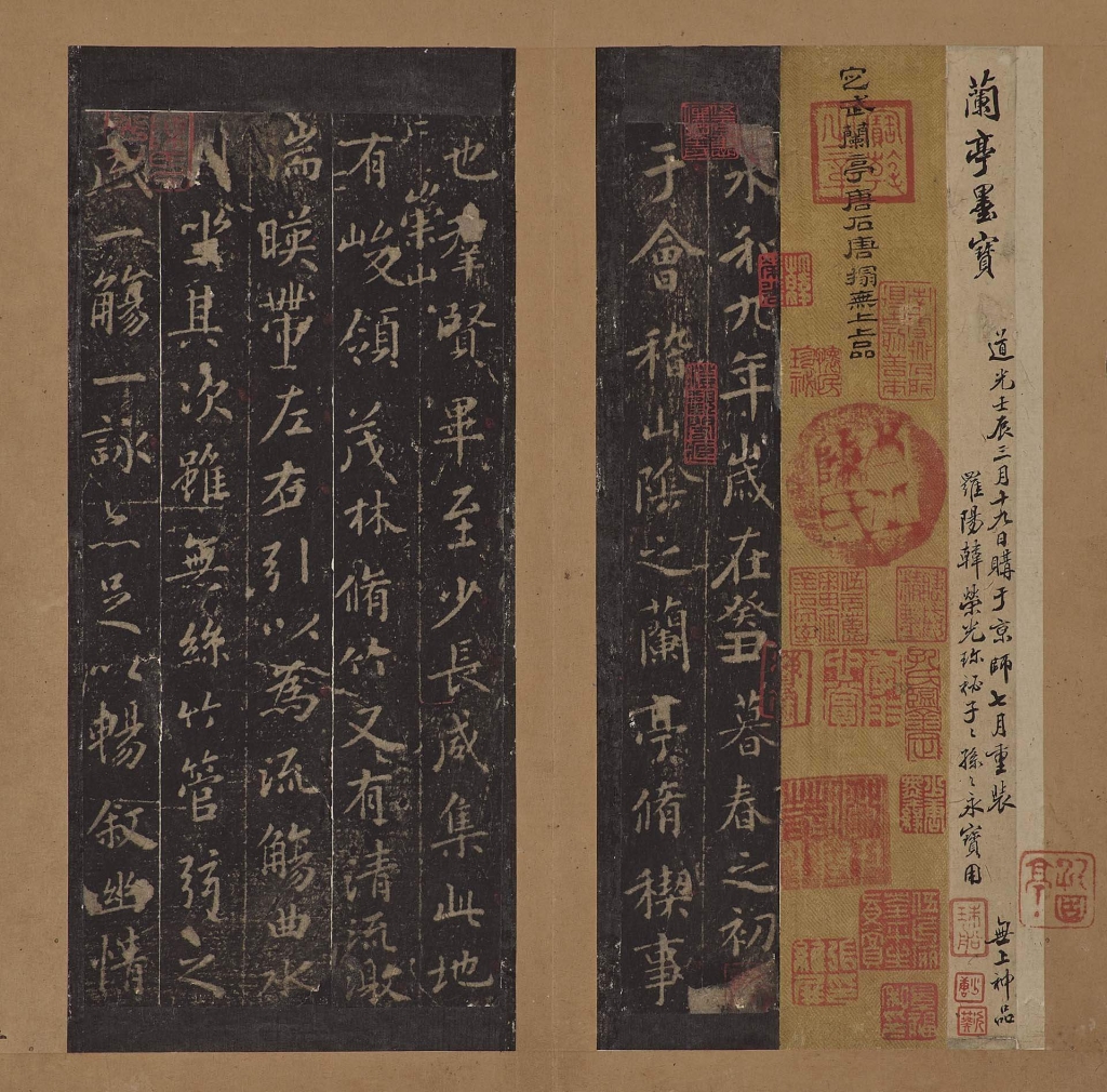 明永樂十五年(1417),周憲王朱有燉刻製了收錄有五本〈蘭亭序〉、李公麟〈蘭亭圖〉及各式〈蘭亭序〉相關文獻的大小〈蘭亭圖卷〉。此後,歷代皇室也相繼刊刻〈蘭亭圖卷〉。清代時,乾隆皇帝以宮中珍藏的明代〈蘭亭圖卷〉原石為基礎,又刊行了新的乾隆版〈蘭亭圖卷〉。由於乾隆皇帝還在開頭添加了御旨和御製詩,使得〈蘭亭圖卷〉每經重刻,其內容就更加豐富,篇幅也越來越長。