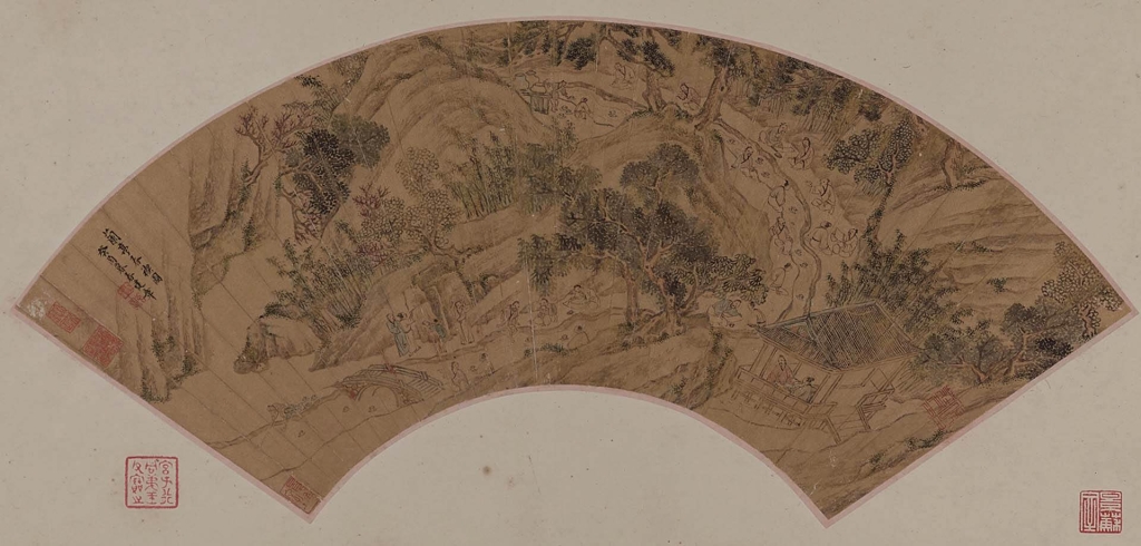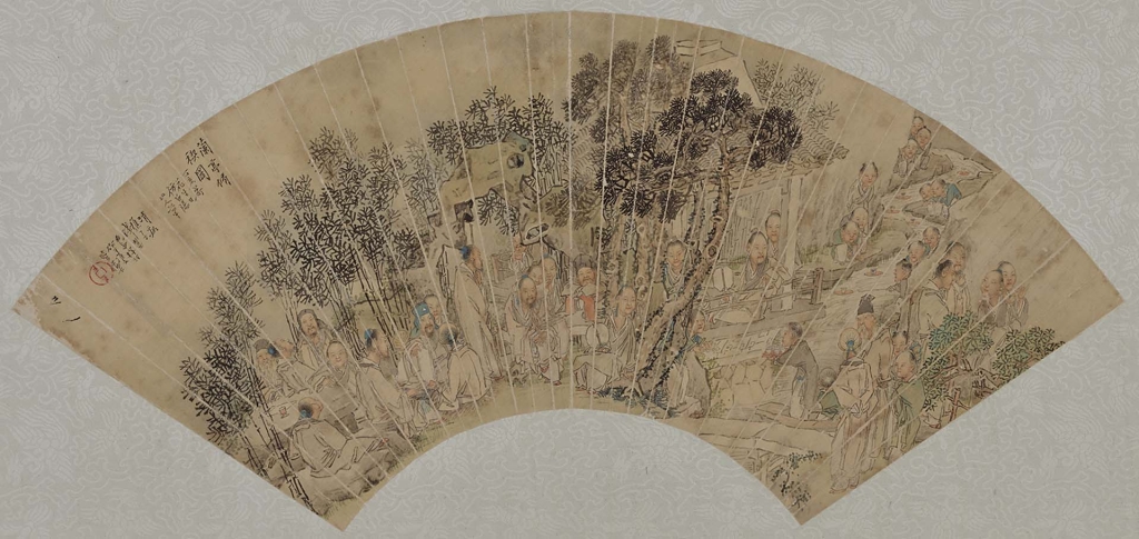 明清之際,扇面形式的〈蘭亭圖〉作為饋贈的禮物被製作而出。在小小的扇面上,仇英以王羲之在亭中揮毫〈蘭亭序〉為主角進行描繪,明代泉州畫家王建章則描繪了曲水在整個扇面上蜿蜒起伏,與會者散布在兩岸,各自展現出宴會整體之情景。而清代錢慧安的畫作,主要以沉浸在宴會、表情豐富的人物表現為亮點。