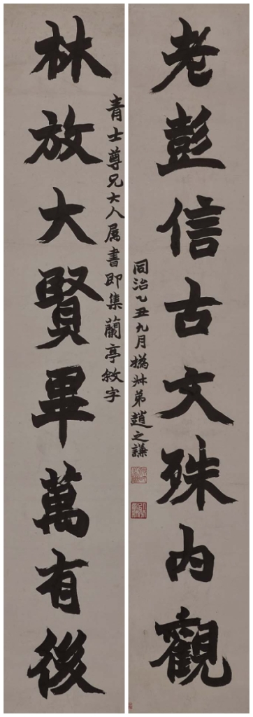 〈蘭亭序〉自古便是膾炙人口的名文,文人墨客們無不通讀其全文。在此背景下,形成了一股任意擇取〈蘭亭序〉中所用文字、作成具多重意義之左右對聯的風氣。就連集碑學派大成的趙之謙,也有集〈蘭亭序〉文字之對聯。此外,宣統皇帝的七言對聯儘管不是集〈蘭亭序〉之文字所寫成,但人們一看到這副對聯,馬上就會意識到那是出自〈蘭亭序〉的集字。