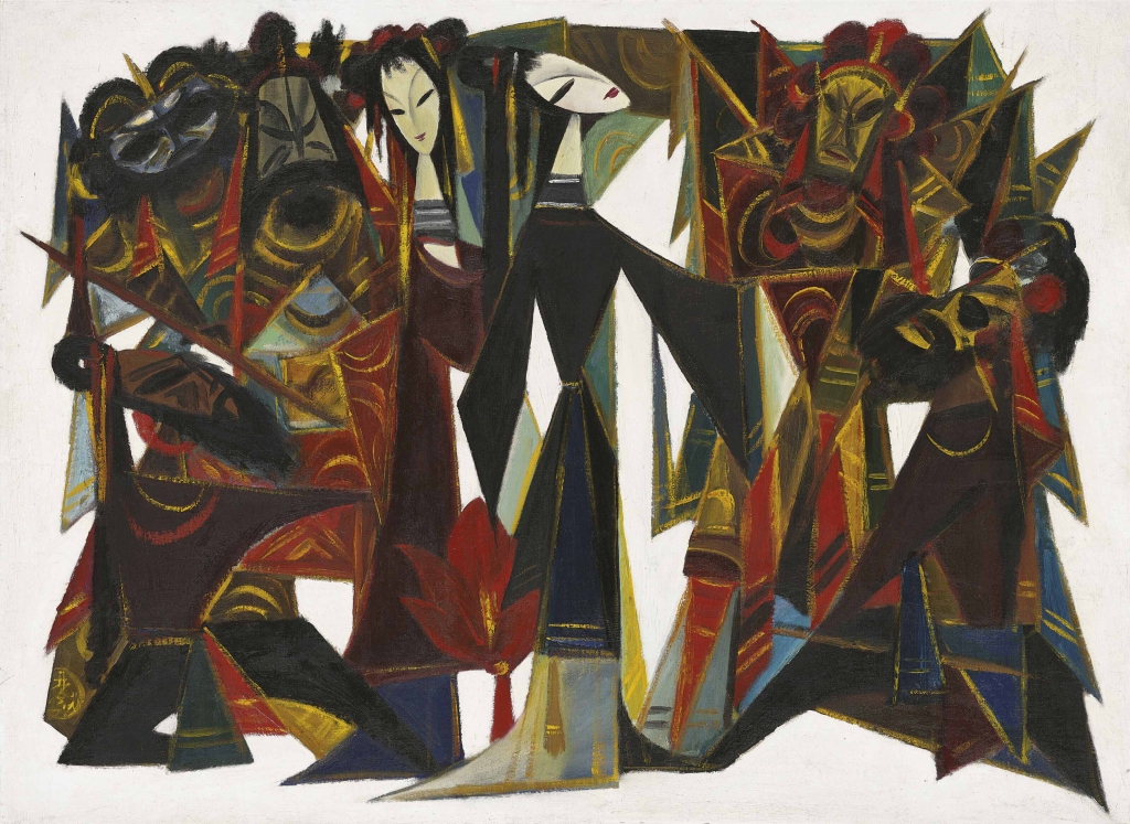 林風眠《戲曲人物:寶蓮燈》來自英國藏家John Molloy,其1962年拜訪林風眠工作室時受贈此作。1950年代後期至1960年代初期,林風眠創作一系列以空白為背景的戲劇題材作品,如《楊門女將》、《白蛇傳》、《霸王別姬》、《連環套》等,將傳統戲曲藝術抽象化、符號化,與西方現代藝術共融,而本幅《寶蓮燈》是這個系列中尺幅較大的作品。值得一提的是,本作為油彩畫布,因題材而納入中國近現代及當代書畫,較為少見。(丁衍庸油彩作品《白褶領女子》同被列入本場)