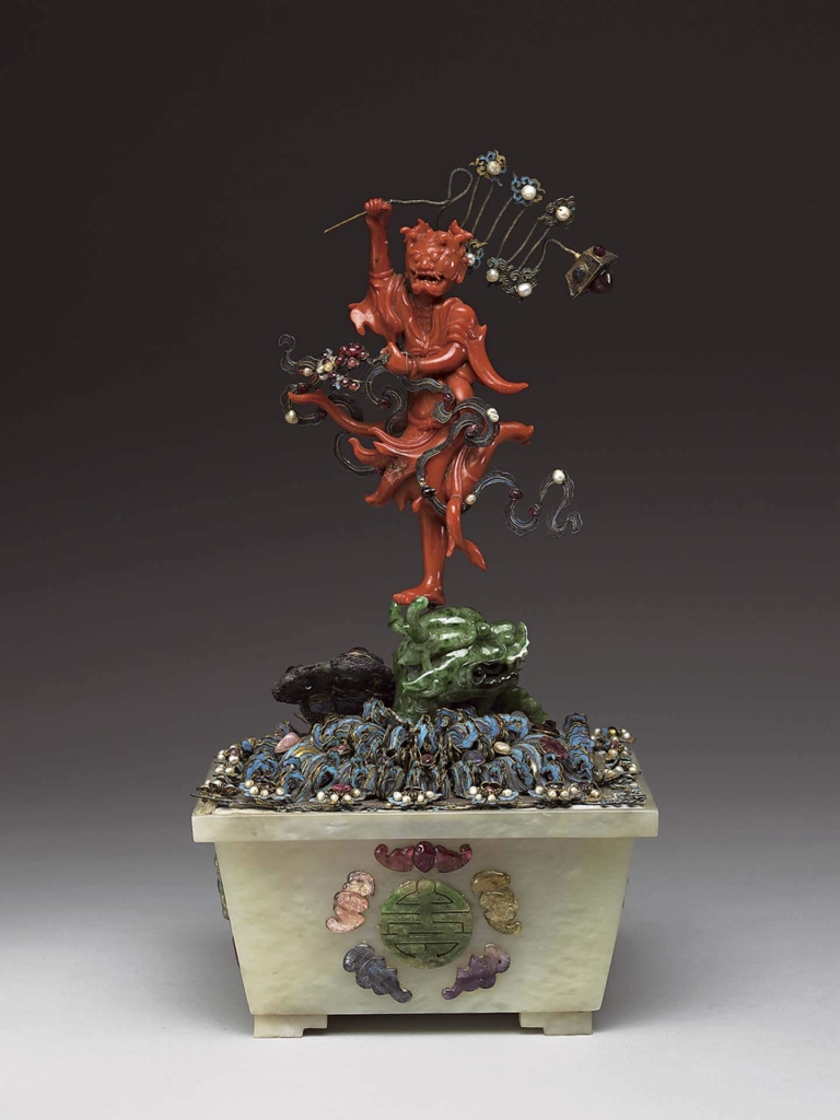 國立故宮博物院藏清〈珊瑚魁星點斗盆景〉,這尊朱紅色的魁星頭上長角,如頭角崢嶸,怒眉瞋目,齜牙咧嘴,手持北斗七星和梅枝,身上纏繞飄帶,單腳立於一隻龍頭魚身的鰲魚頭上,有梅為花魁、獨占鰲頭的寓意。他的另一隻腳向後踢起,方向剛好對應北斗七星中斗狀的主星,正是魁星最典型的形象。